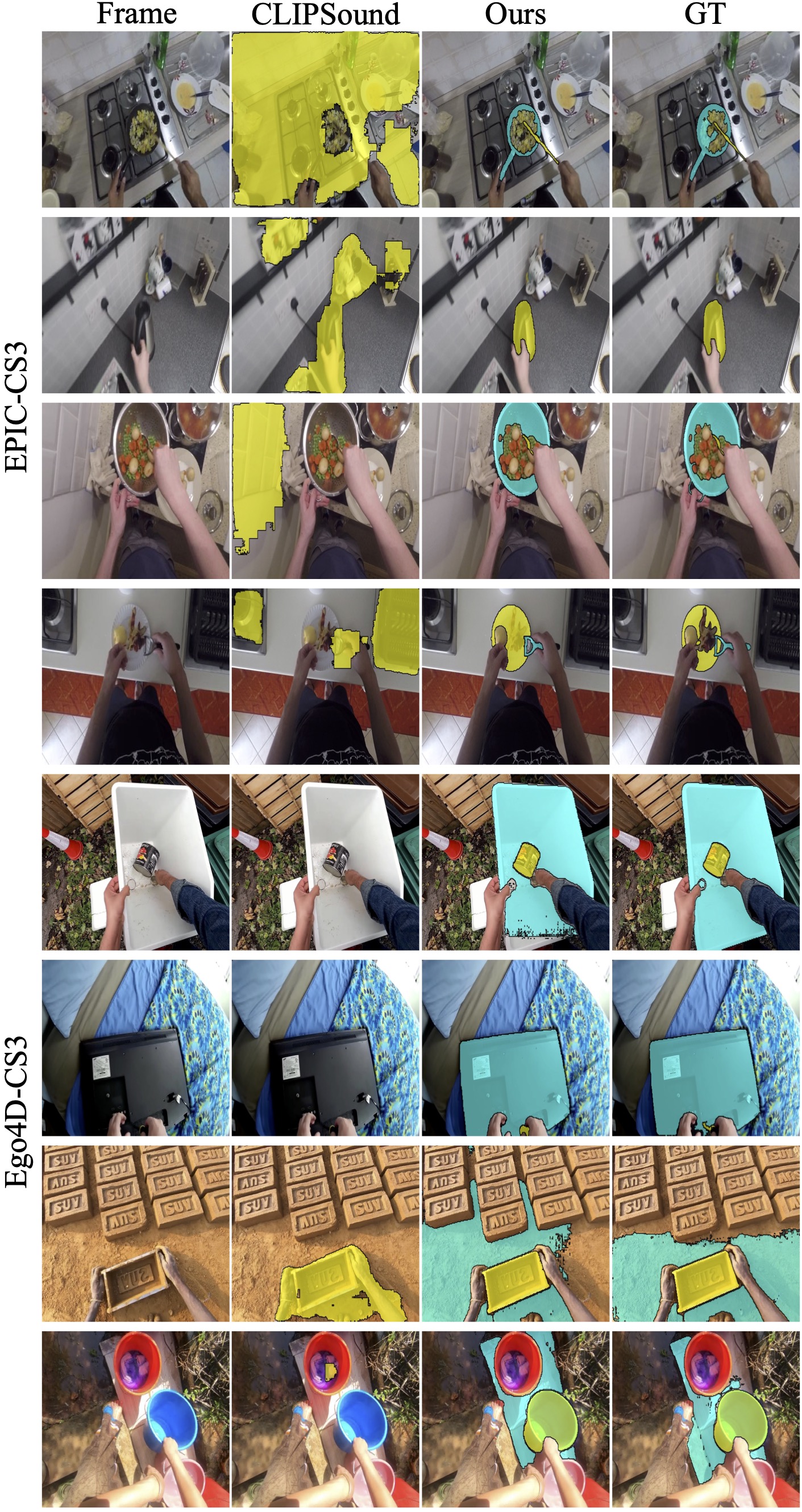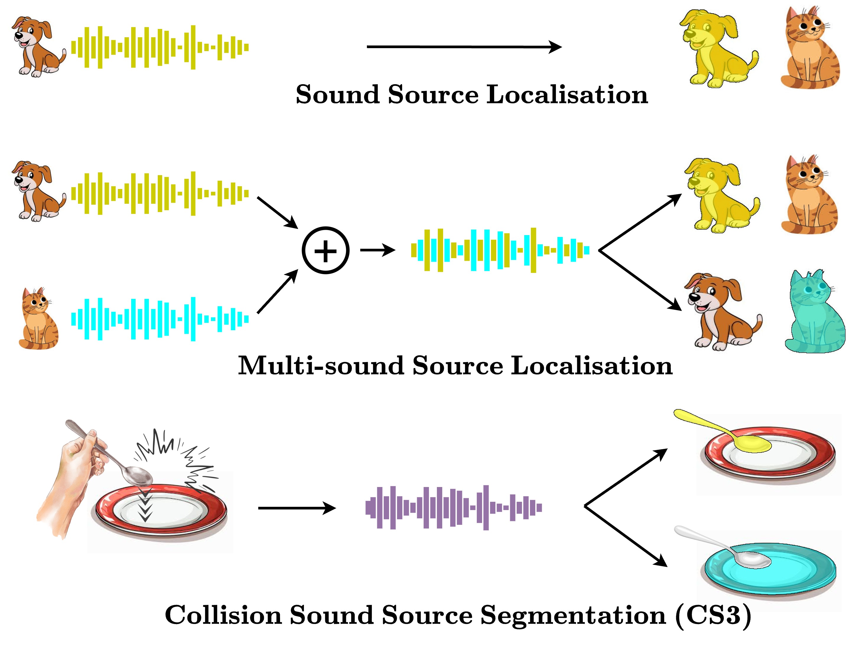 We define our task, Collision Sound Source Segmentation (CS3) as follows: given an audio-visual clip containing a single collision sound, we aim to identify the object(s) causing this collision sound, and output pixel-level segmentations of these objects in a frame within the collision segment. We define a collision sound as one produced when two or more objects (or parts of one object) exert force on each other as a result of an interaction. Crucially, such sound results from the interaction itself and cannot be attributed to either object alone. Our approach is trained with weak supervision, i.e. we require only temporally segmented clips of collisions, without any labels of colliding objects, action semantics or object segmentation masks. Formally, given a collision audio $\mathbf{A}{\in}\mathbb{R}^{1 \times T}$ and an image $\mathbf{I}{\in}\mathbb{R}^{3 \times H \times W}$ from a video, we learn a function to segment object(s) responsible for the collision: $$f: (\mathbf{I}, \mathbf{A}) \rightarrow \{\mathbf{M}_k\}_{k=1}^n$$ where $n{\in}\{1, 2\}$, and each $\mathbf{M}_k{\in}\{0, 1\}^{H{\times}W}$ denotes the mask for the $k^\text{th}$ colliding object.